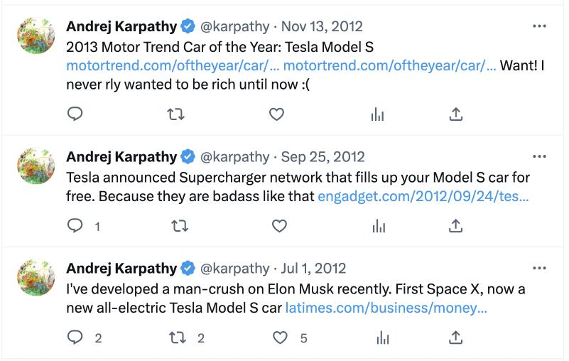 那年秋天,当他因为参与 ImageNet 竞赛事务而忙得不可开交的时候,他同时也正醉心于特斯拉量产不久的 Model S,甚至在竞赛结果揭晓的前几天还发布关于 Model S 的推文——当时,他也在推特上表达了对马斯克的赞赏。