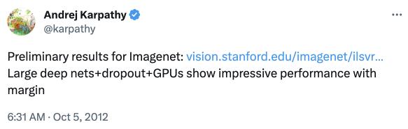 作为李飞飞团队的一员,Andrej Karpathy 自然也要参与其中——于是,2012 年 10 月 5 日,Andrej Karpathy 早上六点半就在推特上公布了本次 ImageNet 竞赛的成绩。