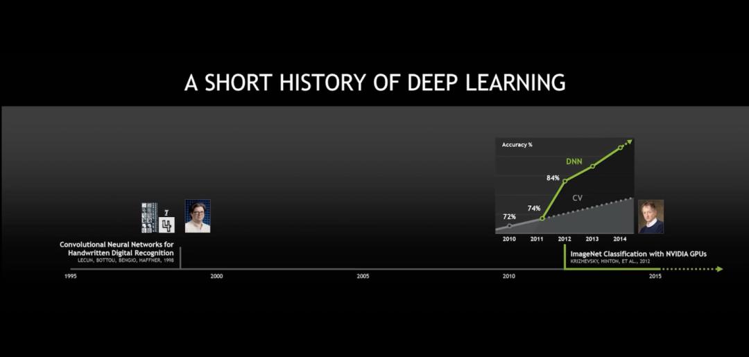 原来,AlexNet 赢得 ImageNet 竞赛冠军之后,在 2012 年到 2013 年之间,有一些团队找到英伟达,表示要通过 GPU 做基于深度学习的计算机视觉。这让黄仁勋意识到,深度学习可能会迎来爆发,而英伟达的 GPU 技术也会因为对深度学习和计算机视觉算法的支持而开辟出一个广阔的市场。