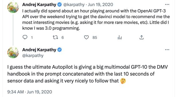 不仅如此,即使是在特斯拉任职期间,Andrej Karpathy 也一直保持对 GPT 的密切关注。一个典型的证据是,在 2020 年 8 月,GPT-3 正风靡全球,而 Andrej Karpathy 在重写特斯拉 Autopilot 算法架构的关键过程中,他依旧用自己的业余时间写了一个小型的 GPT 训练库,并称之为 minGPT。