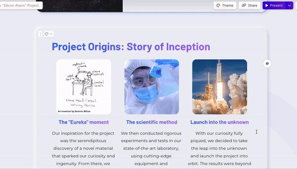 在采访中,Gamma的创始人Grant Lee 告诉硅星人,新一代的演示不应该只局限于文字、表格和图片,还应该有更多有趣的、具有交互性的内容呈现。比如用户能够在演示中添加自己喜欢的动图、视频等,能够更加个性化的进行观点和成果的表达。