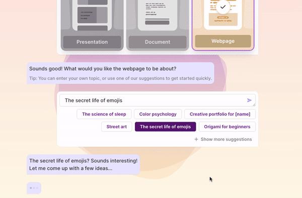 比如硅星人选择用“emojis的秘密”这个主题来生成网页,AI就将自动根据这个主题为你生成逻辑清晰的大纲,包括“emojis的发展历史”、“emojis是怎么被创造出来的”、“流行的emojis背后的意义”、“emojis的社会影响和营销”等内容。(讲真,让硅星人自己想半个小时估计也不能把一个简单的emojis想出这么多花样来)