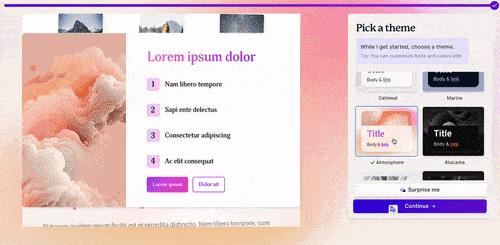 一切就绪之后,点击“继续”,Gamma将根据主题为你提供不同色调的模版配色选择。选定模版后不满意不要紧,你可以随时对模版的配色和内容细节进行调整。