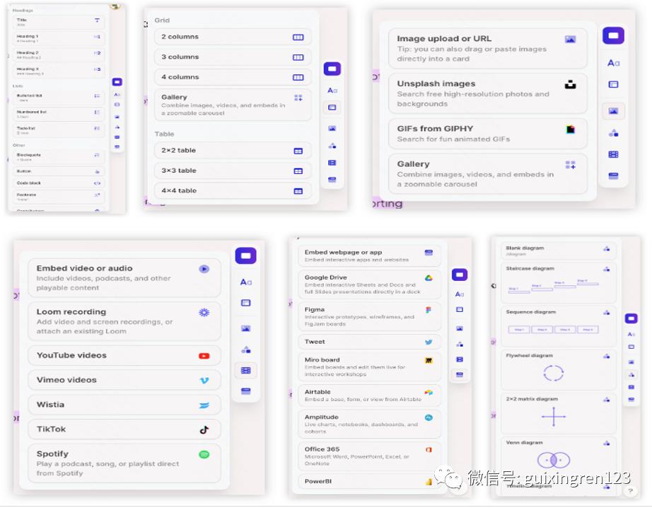 总体来看,Gamma可以说是在保留了原有PPT的基础功能和格式基础上,集成了Notion等新一代生产力工具的各种个性化编辑能力。其可插入的模块丰富度甚至超过了 Notion,特别是涉及 PPT和网页编辑的示意图选项非常多,最大化去赋能文档演示。