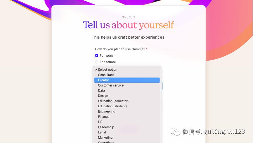 首先,告诉Gamma你的使用角色以及这个演示文稿的用途。接着,“魔法”开始。
