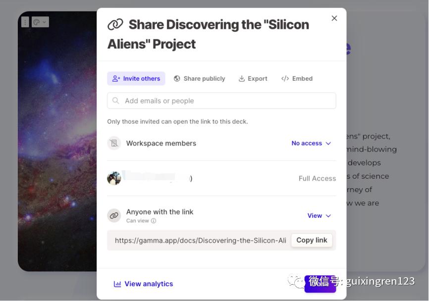 此外,Gamma另一个很棒的设计在于,每个人都有自己的一个专属的工作空间,你所有生成和编辑的演示文稿都会被存在这个空间里,便于查找和管理。所有的文档都是支持共享合作的,对于团队合作十分友好,你可以通过链接的方式将作品分享给指定的人,也可以公开发布让更多人看到。