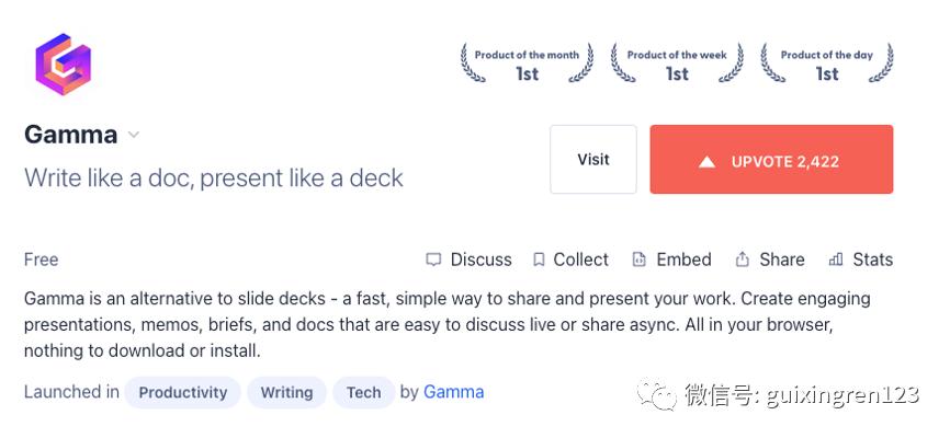 关于Gamma,目前很多人对它的评价是“Notion和PPT生的儿子”、“新一代PPT的革命者”、“AI时代的新演示模式”。还在产品原型期时,Gamma就获得了来自硅谷著名风投Accel以及Zoom CEO袁征、 LinkedIn前CEO Jeff Weiner等大佬的投资。去年8月17日,Gamma Beta版首次登陆Producthunt,便迅速拿下了当日、当周、当月的冠军榜。