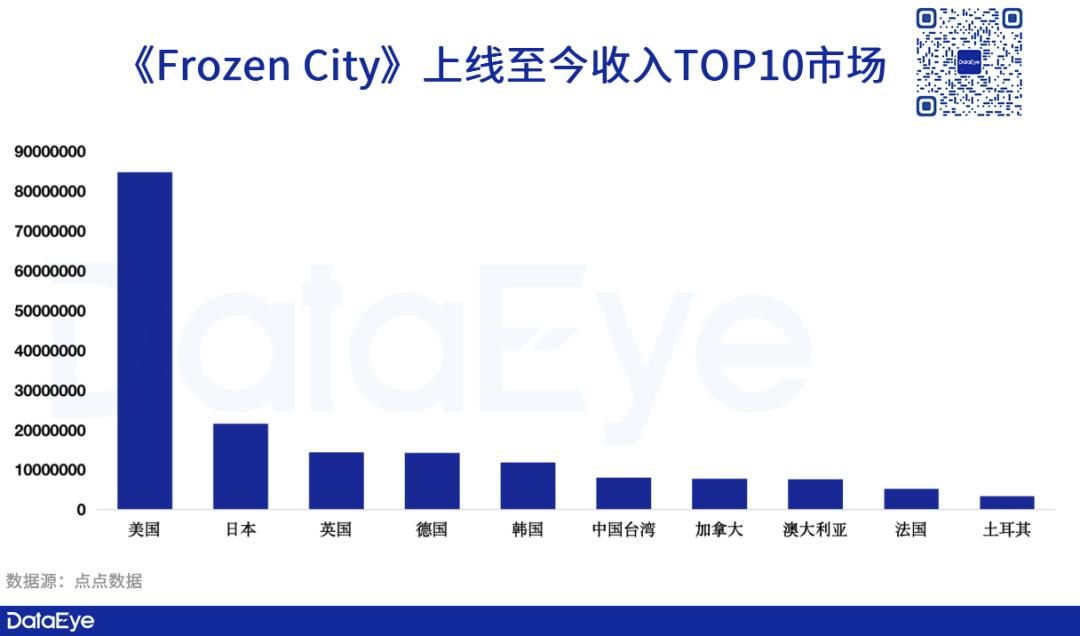 《Frozen City》则是在美国、日本、英国三个市场更受欢迎。并且单美国市场的收入,就突破8000万元的量级。