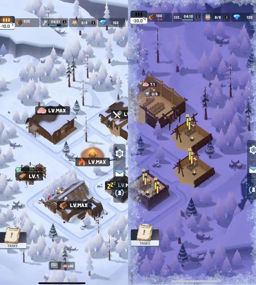 在玩法方面,《Frozen City》的玩法主要体现在:放置+建造(模拟经营)+RPG卡牌融合玩法。