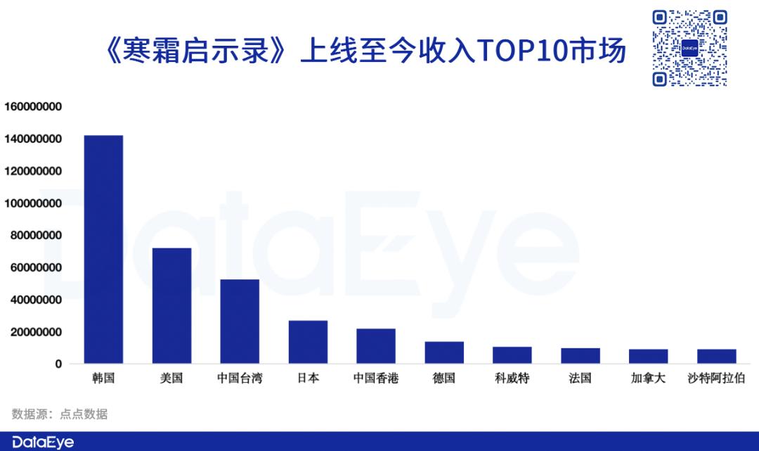 具体各个市场方面,《寒霜启示录》收入TOP3市场是在韩国、美国、中国台湾。值得注意的是,韩国与美国市场的付费量级拉开了近一倍的差距。