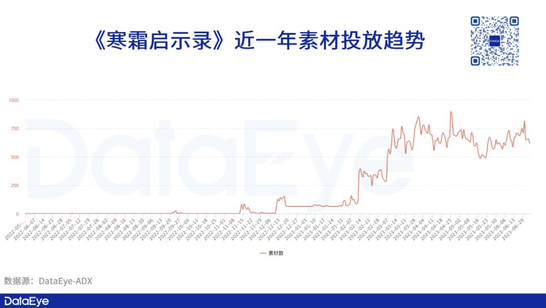 从投放趋势来看,《寒霜启示录》是自今年2月份起开始进行起量,在此之前,日均素材投放量不到百组,在此之后,投放量成倍增长,并且至今仍保持较高量级的素材投放。