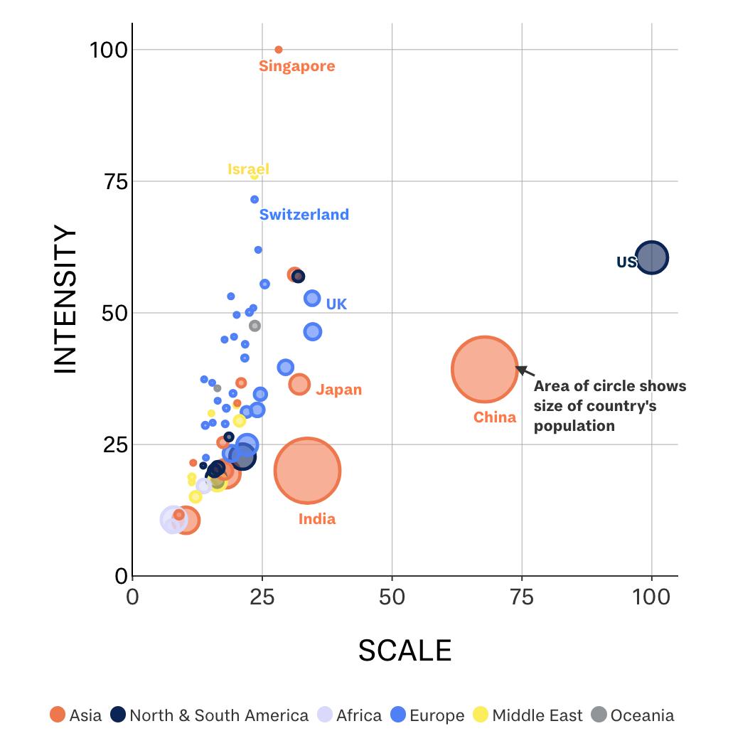 - 在人工智能强度维度中,新加坡、以色列和瑞士处于领先地位,这意味着这些国家在考虑相对于其人口和经济规模的人工智能能力时,表现最佳。