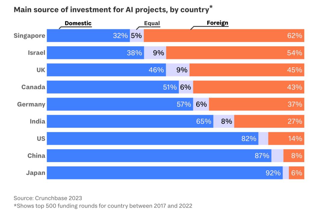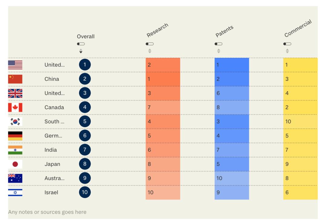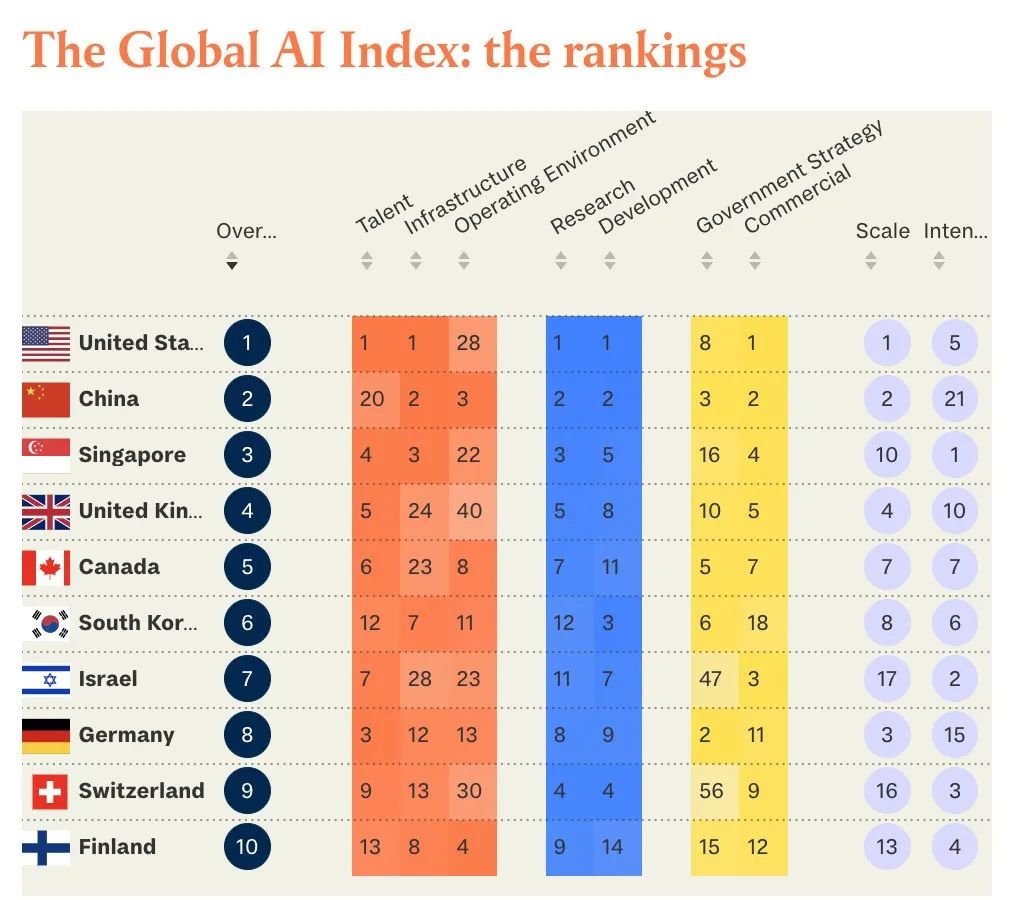 英国在今年的排名中从第三位上升至第四位。考虑到英国得分基本保持不变,排位变化是新加坡强劲崛起引起的。事实上,英国在人工智能研究、人才和商业生态系统方面拥有整体优势。