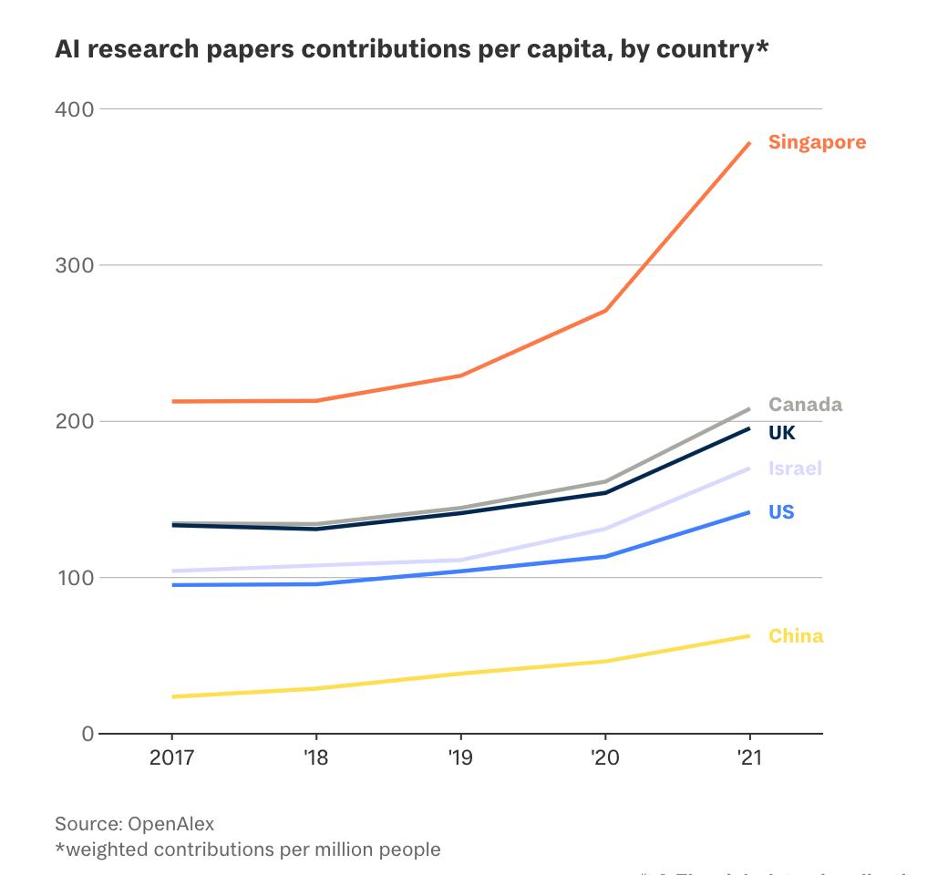 在研究和发展维度上,新加坡已从2020年的第14位上升到2023年的第3位和第5位,特别是因为新加坡在过去五年中,对人工智能的人均贡献高于总体增长全球研究论文数量(从2017年每百万人212篇贡献增至2021年每百万人379篇)。