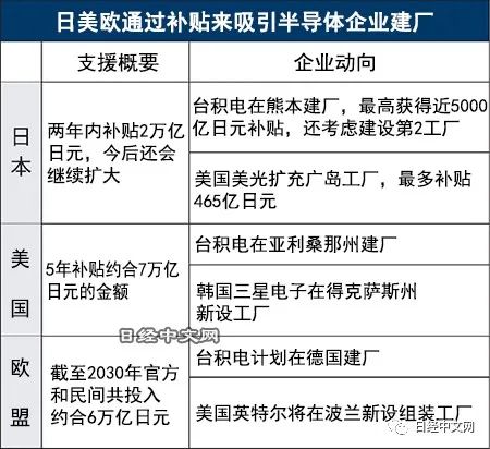 日美欧对半导体短缺抱有危机感,为了扩大本国生产,通过巨额补贴制度进行招商引资。日本针对截至2023年度的两年确保了2万亿日元左右的预算。