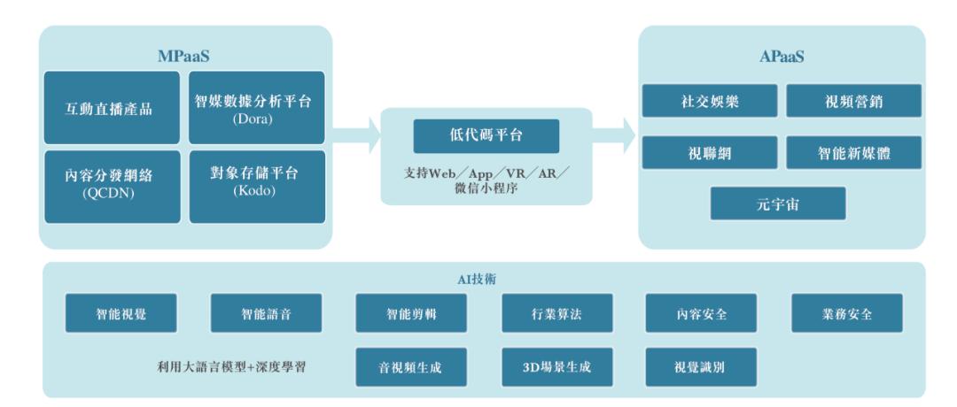 作为中国最早提供音视频云服务的平台之一,七牛云是为数不多的拥有开发全 面且高性能的MPaaS产品、拥有集成且覆盖音视频业务各环节的技术能力的公司之一——七牛云的MPaaS产品利用一系列音视频技术及一系列AI技术,可提供涵盖专有内容分发网络(“QCDN”)、对象存储平台(“Kodo”)、互动直播产品以及智媒数据分析平台(“Dora”)等环节的一系列音视频解决方案,主要服务于开发能力强及具有较强灵活性需求的客户。