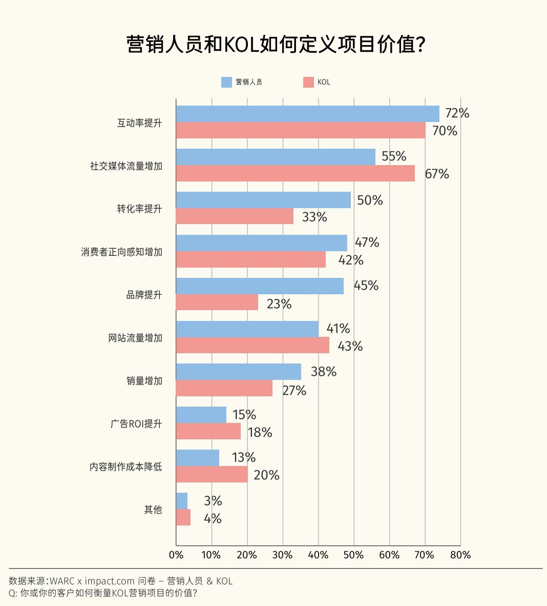 对于如何衡量营销项目的价值和表现,在调研中,营销人员和KOL都认同营销带来互动率提升的指标,但在其他考量指标上持有不同的观点。比如,KOL更加重视社交媒体流量的增加,对转化率提升的认同度较低,而营销人员对于社交媒体流量以及转化率都持有相同的重视度。
