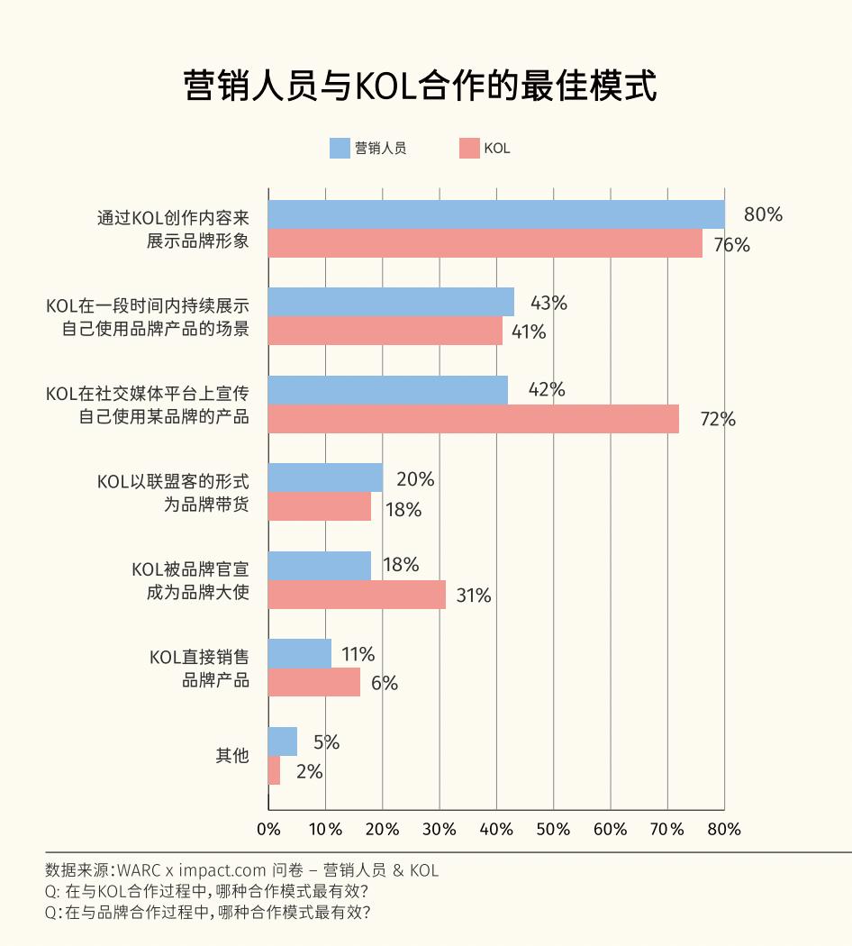 impact.com《报告》显示,品牌与KOL合作,最受欢迎的模式是由KOL创作内容来展示品牌形象,有80%的营销人员认为这种方式很有效。同时,还有其他一些合作模式,比如对于快消品类,KOL可以展示一段时间内持续使用某品牌产品;或是在社交媒体宣传自己使用某品牌产品等。