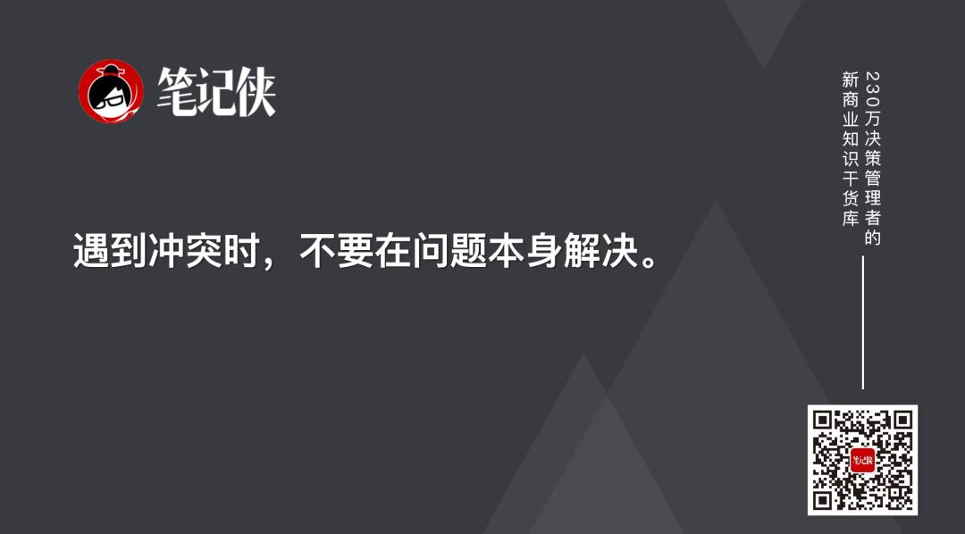 遇到冲突时,不要在问题本身解决,而是要在问题升级后,讨论对共同完成目标的意义,如何将冲突问题转化为支持两个团队共同完成目标的解决方案。