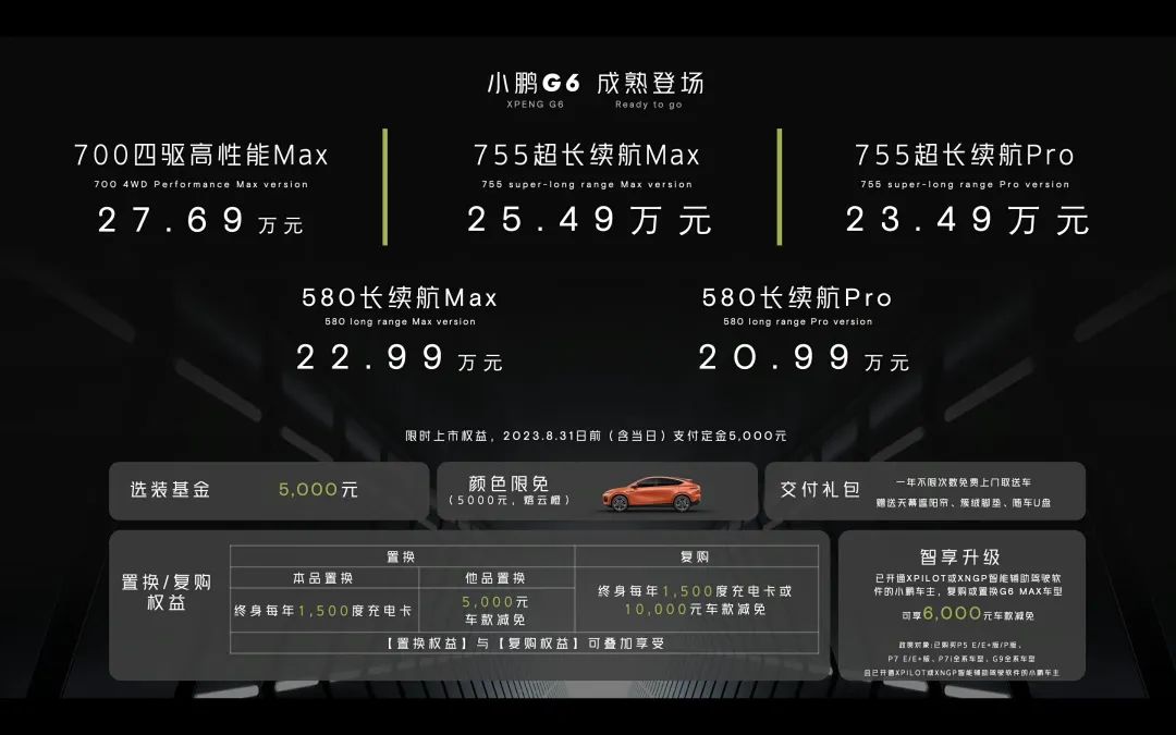 并且用户8月31日前付定金5000元,还享受5000元选装基金等权益,老车主复购还可获终身每年1500度电或抵扣1万元车款,这意味着老车主最低20万就能入手一辆小鹏G6。