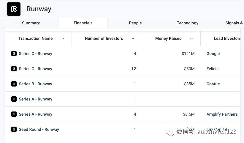 作为一个大模型公司,Runway此前的融资规模都不算太大。2021年底,Runway以 2 亿美金的估值完成了 B 轮融资 3500 万美元融资,2022 年底,Runway 又完成了 5000 万美元的 C 轮融资,估值达到 5 个亿。
