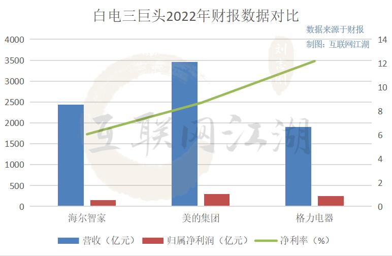 2022年财报数据显示,海尔智家实现营收2435亿元,低于美的集团的3457亿元,高于格力电器的1902亿元,处于中间位置。