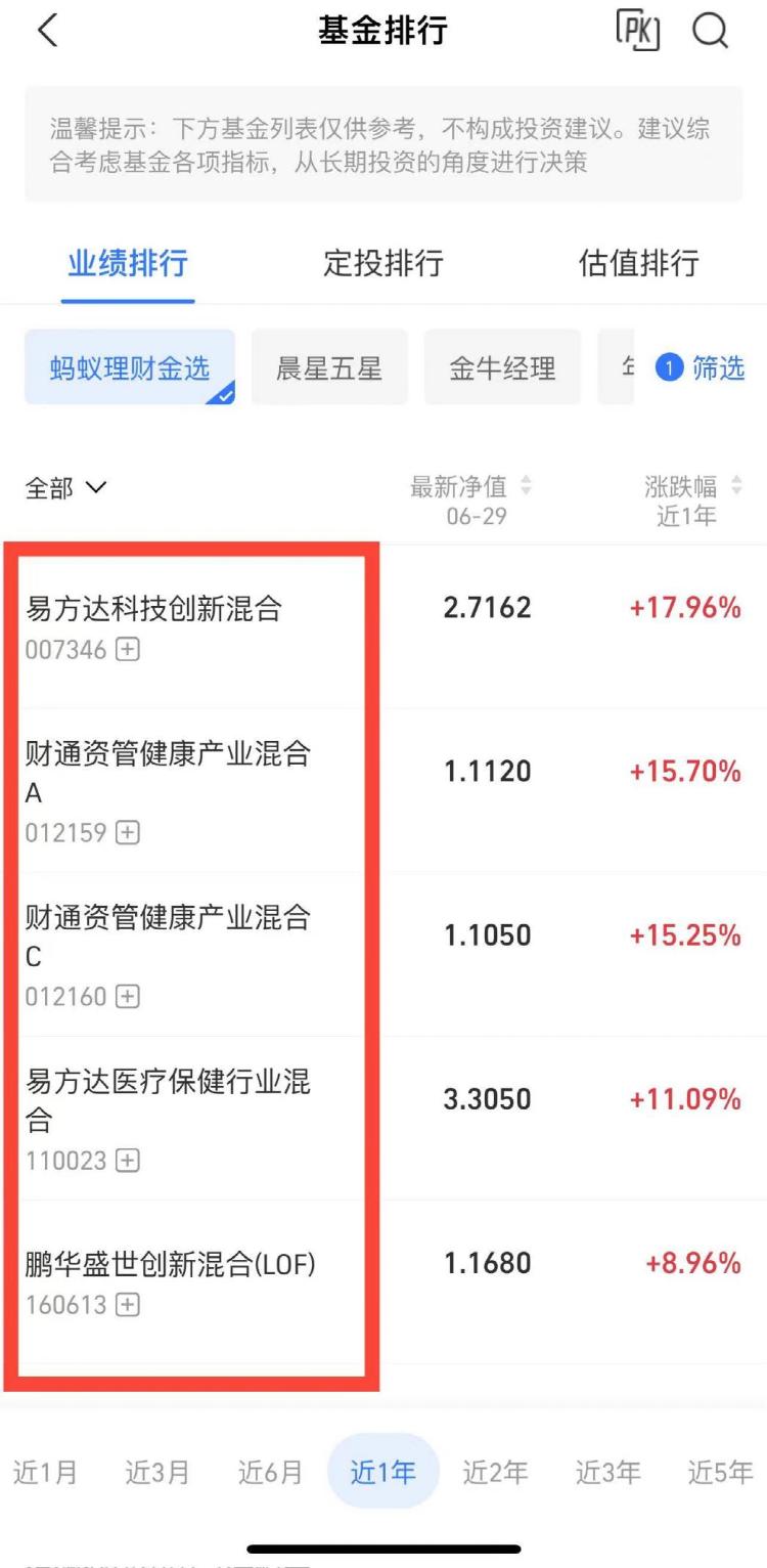 而基金君登录蚂蚁财富APP发现,在基金排行-业绩排行中,“蚂蚁理财金选”中的偏股型基金的名单跟中证指数公司此次推出的“金选指数”的成分基金,重合度极高。