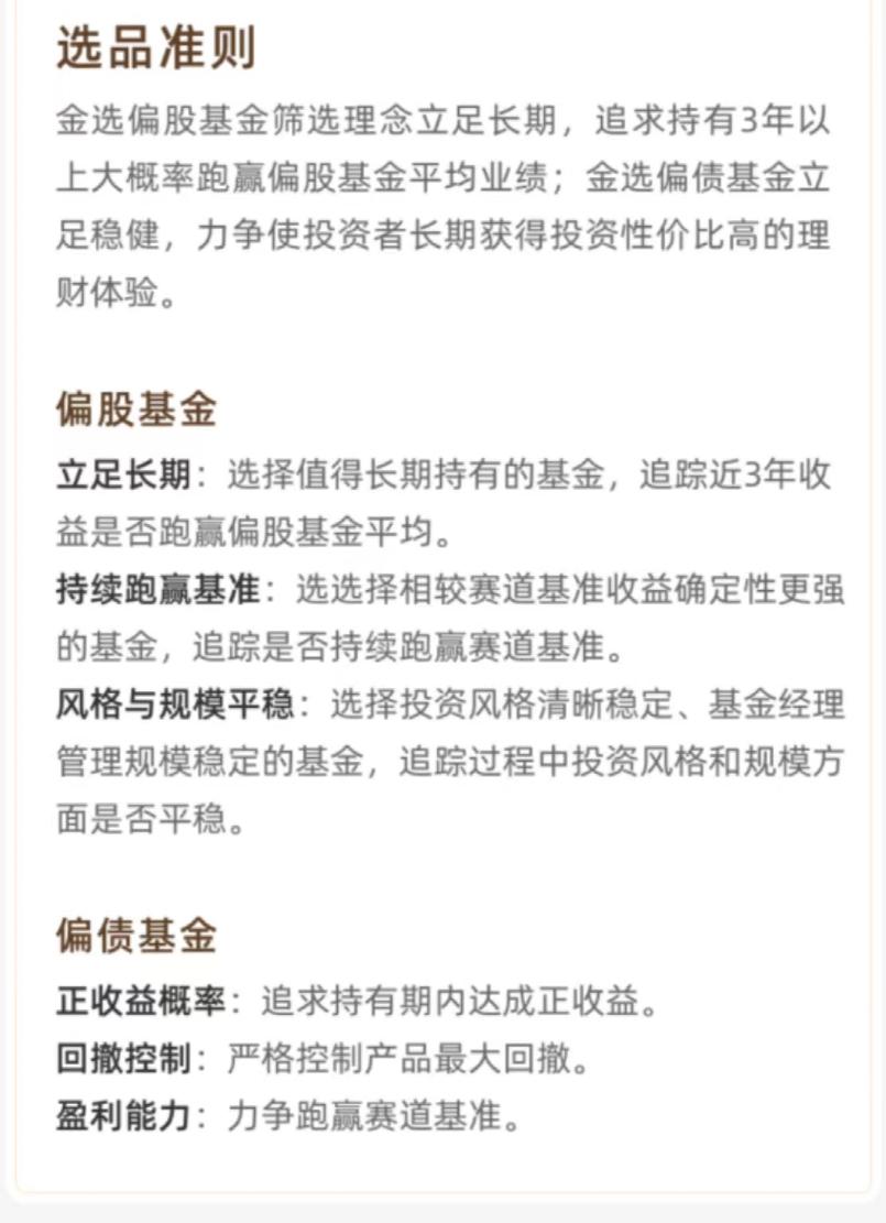 其中写道:金选偏股基金筛选理念立足长期,追求持有3年大概率跑赢偏股基金平均业绩。其中三个标准,一是立足长期:选择值得长期持有的基金,跟踪近3年收益是否跑赢偏股基金平均。