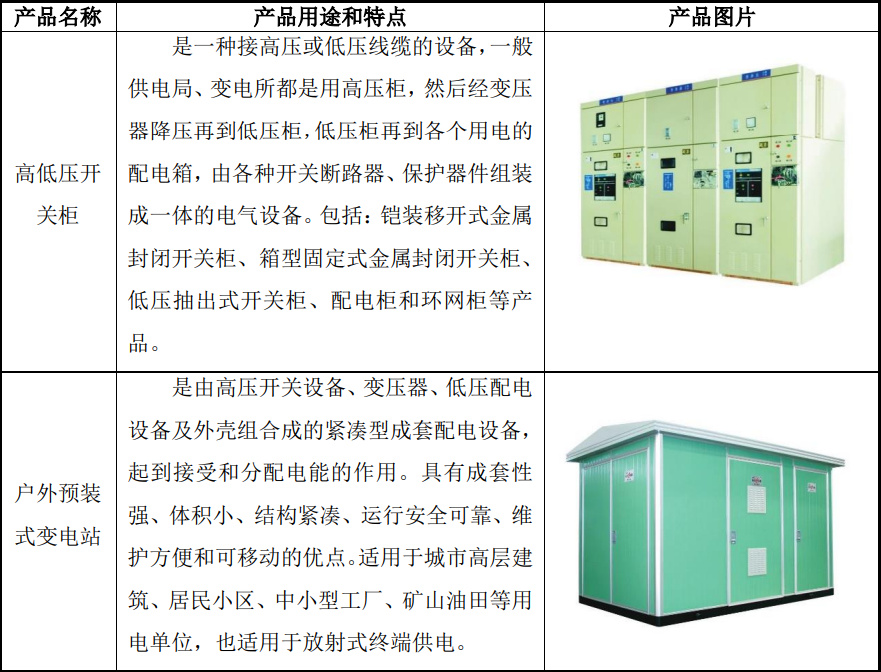 公司主要产品包括高低压开关柜、配电柜、环网柜、变电站和变压器等输配电及控制设备。
