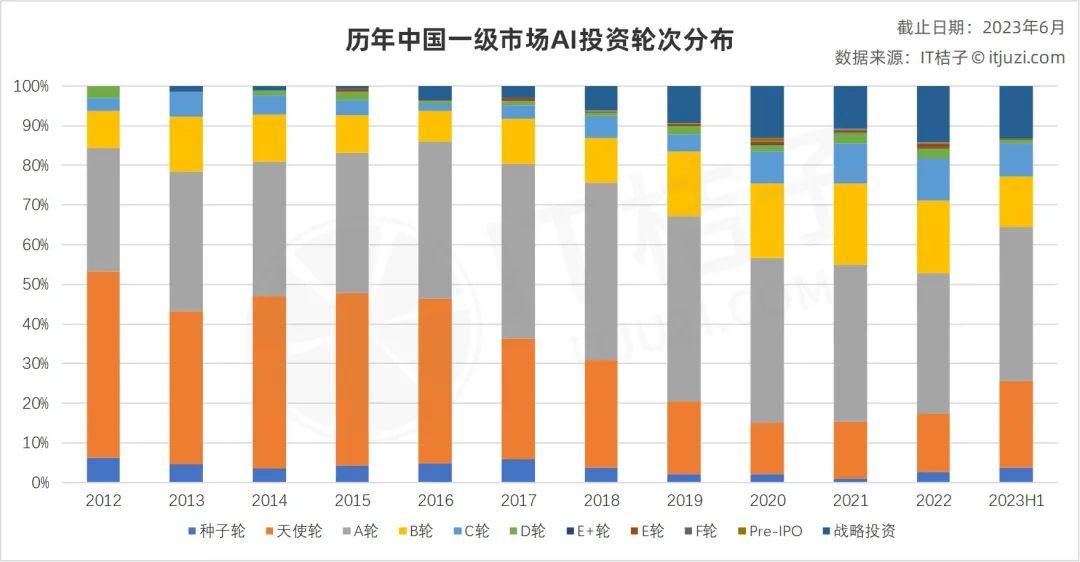2019 年及之前,中国 AI 的早期投融资(A 轮及之前)占比都在 64% 以上,在近几年才下降到 60% 以下,成长期的投资比例开始提升。细微的变化是,在 2023 上半年,早期投资比例再次回升,提高到 63% 左右——初创的 AIGC 相关公司融资对市场的影响在此处略有了一些存在感。
