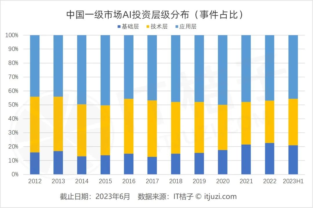 一级市场对 AI 的投资占比上,一直以来距离商业化更近的应用层公司受到最多的投资青睐。占比始终接近 50%。