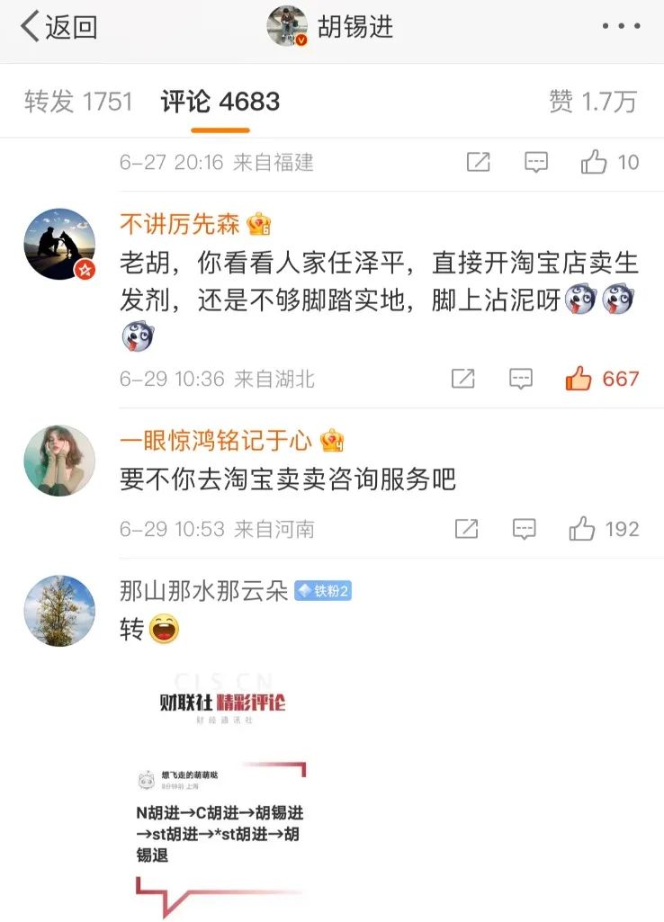 胡锡进炒股赔钱,网友喊话:不如去开个淘宝店