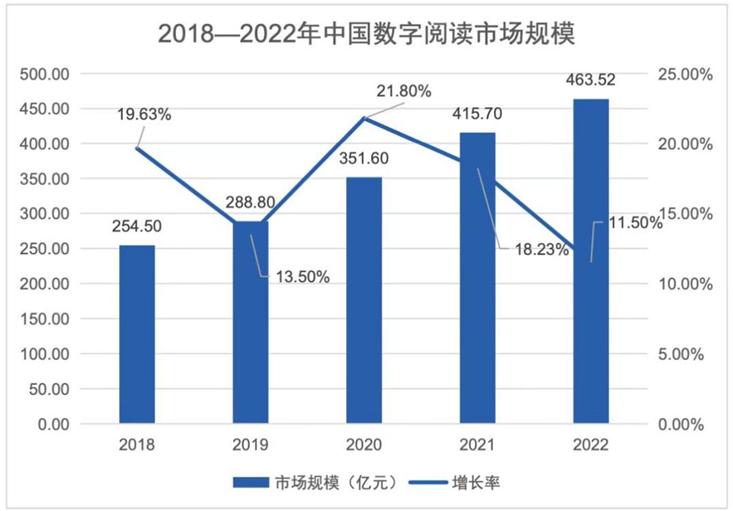 根据最新发布的《2022年度数字阅读报告》,2022年我国数字阅读市场总体营收规模为463.52亿元,同比增长11.50%;数字阅读用户规模达5.30亿,增长率为4.75%。在阅读形式偏好方面,电子阅读形式使用度高达93.4%。