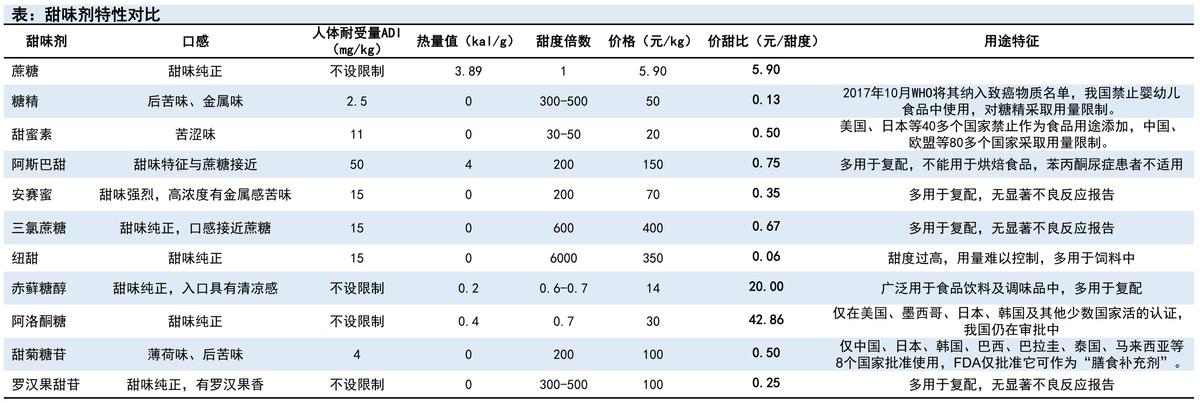 以被饮料厂商和消费者广泛追捧的赤藓糖醇为例,赤藓糖醇甜度为蔗糖的0.6~0.8,但单位热量只有蔗糖的5%,一度被捧上代糖神坛,并牵动着主营赤藓糖醇的三元生物、保龄宝等企业的业绩。
