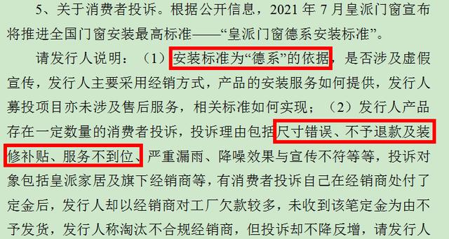 2022年7月,中国证监会在问询函中要求皇派家居说明安装标准为“德系”的依据,是否涉及虚假宣传,皇派家居主要采用经销方式,产品的安装服务如何提供,皇派家居募投项目亦未涉及售后服务,相关标准如何实现。