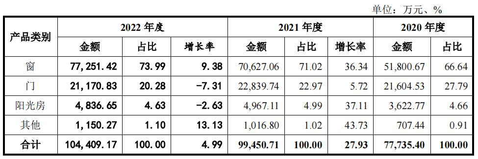 报告期内,窗类业务毛利率分别为38.31%、35.00%、35.72%。同期,门类业务、阳光房业务毛利率也承压,分别从2020年的38.73%、37.03%下降至下降至2022年的37.22%、23.56%。