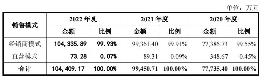 招股书显示,报告期内,经销模式下的收入占主营业务收入比例分别为 99.55%、99.91%和 99.93%,呈逐年上升的趋势。