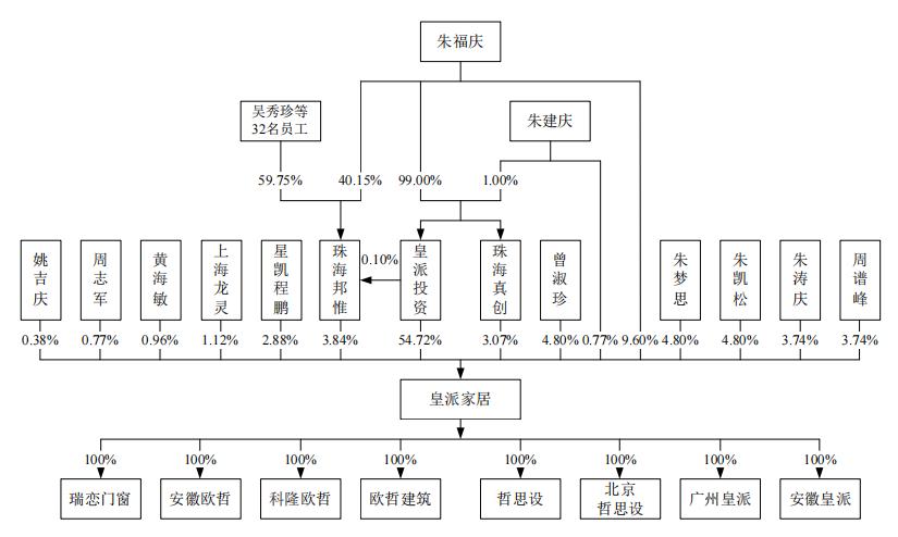 此外,皇派家居是典型的家族企业。招股书显示,其控股股东皇派投资为朱福庆持股99%、其弟弟朱建庆持股1%的企业;第二大股东朱福庆直接控制皇派家居9.6%股权并担公司董事长,第三大股东为朱福庆之妻曾淑珍,持股4.8%;第四大股东为朱福庆之女朱梦思,持股4.8%;第五大股东为朱福庆之子朱凯松,持股4.8%。其中朱福庆、朱梦思为皇派家居的实际控制人,两人合计控制皇派家居76.03%的股份表决权。