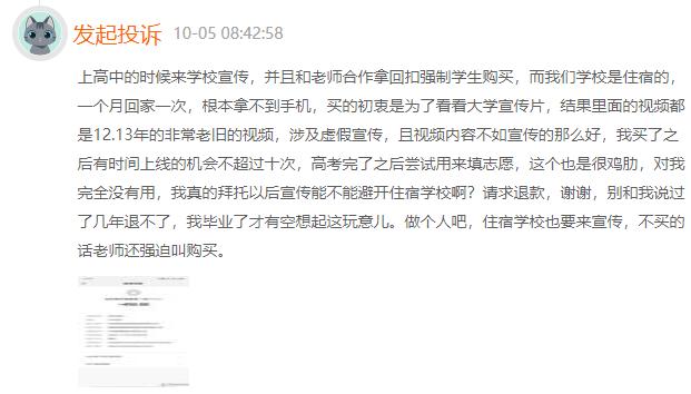 无独有偶,另一条投诉显示,“当时买的时候学校一直在推,说什么自愿购买,一直在说高考填志愿的时候是有用的,我的学姐学长也买了报考的时候发现一点用处没有根本传不进系统。”