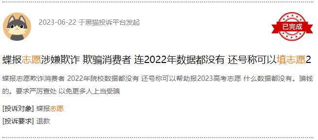“蝶报志愿欺诈消费者,2022年院校数据都没有,还号称可以帮助报2023高考志愿,什么数据都没有,骗钱的。要求严厉查处,以免更多人上当受骗。”