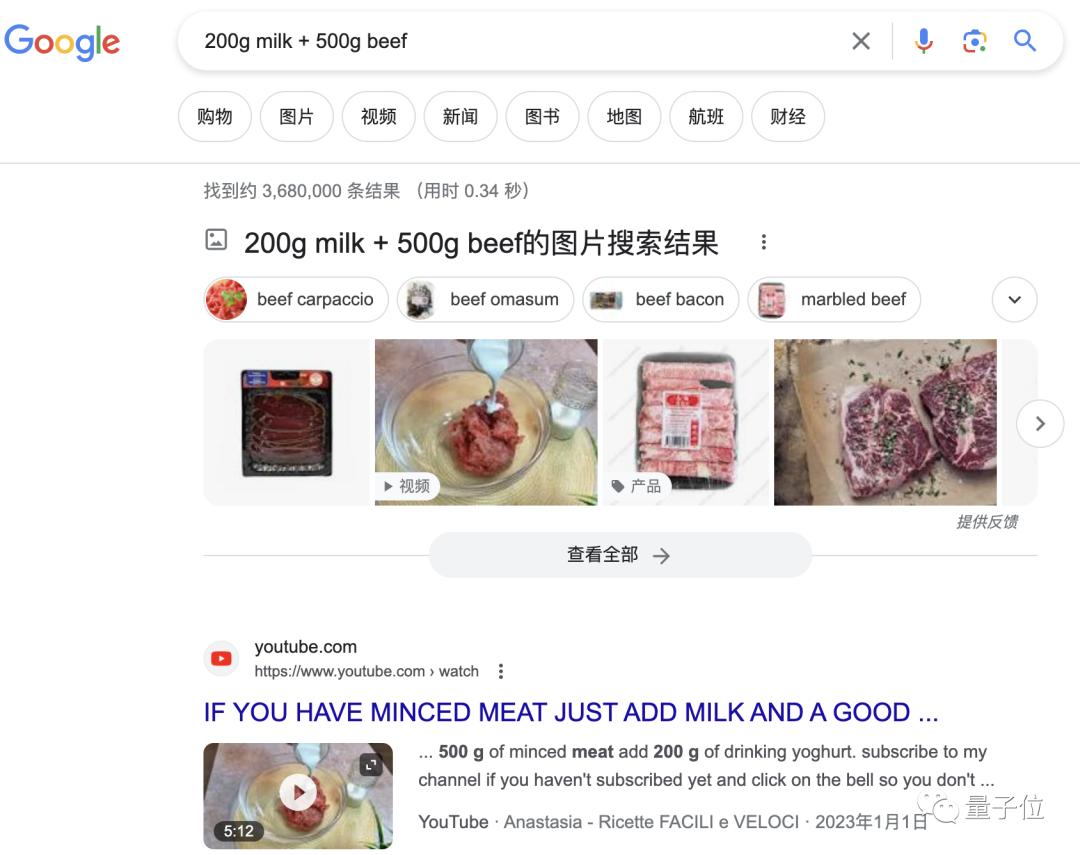 比如,当我们在谷歌搜索框中输入 200g milk + 500g beef 时,出现的是食品广告图和教你做菜的内容。