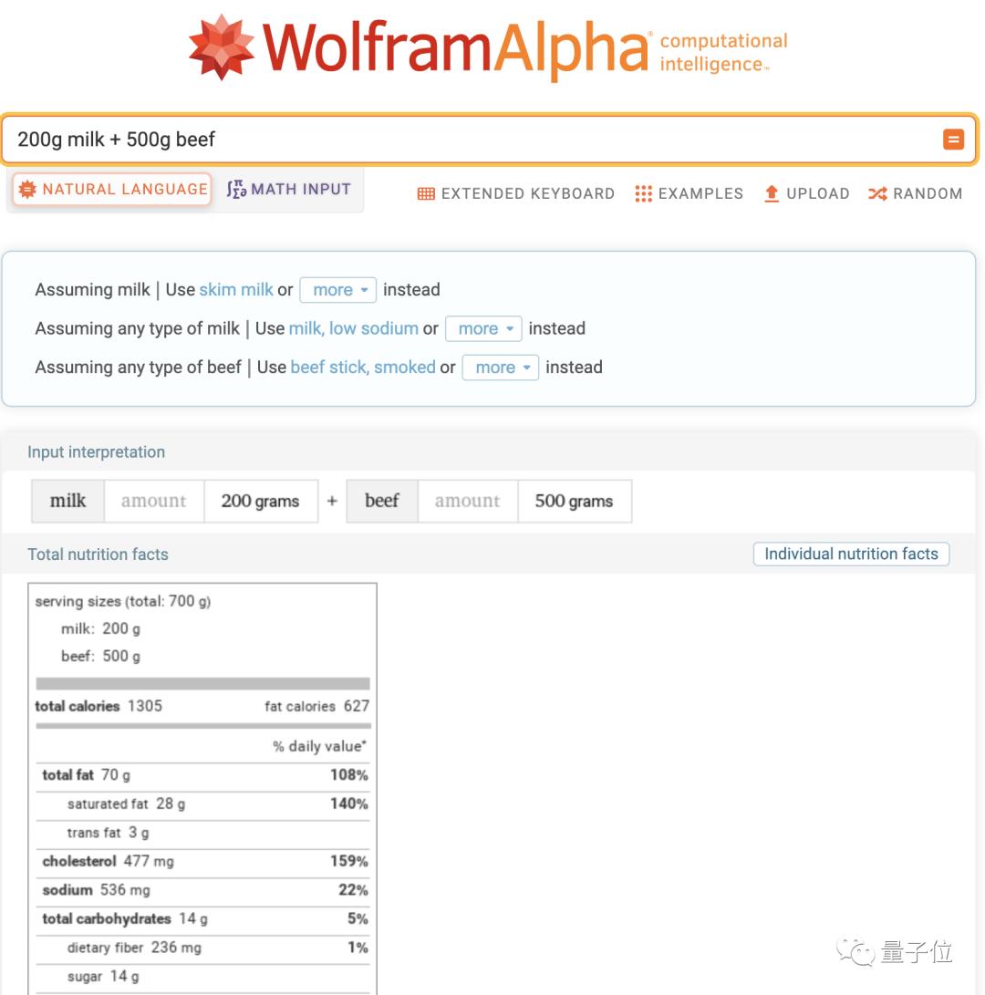 在WolframAlpha上,出现的则是对应食物的营养表。