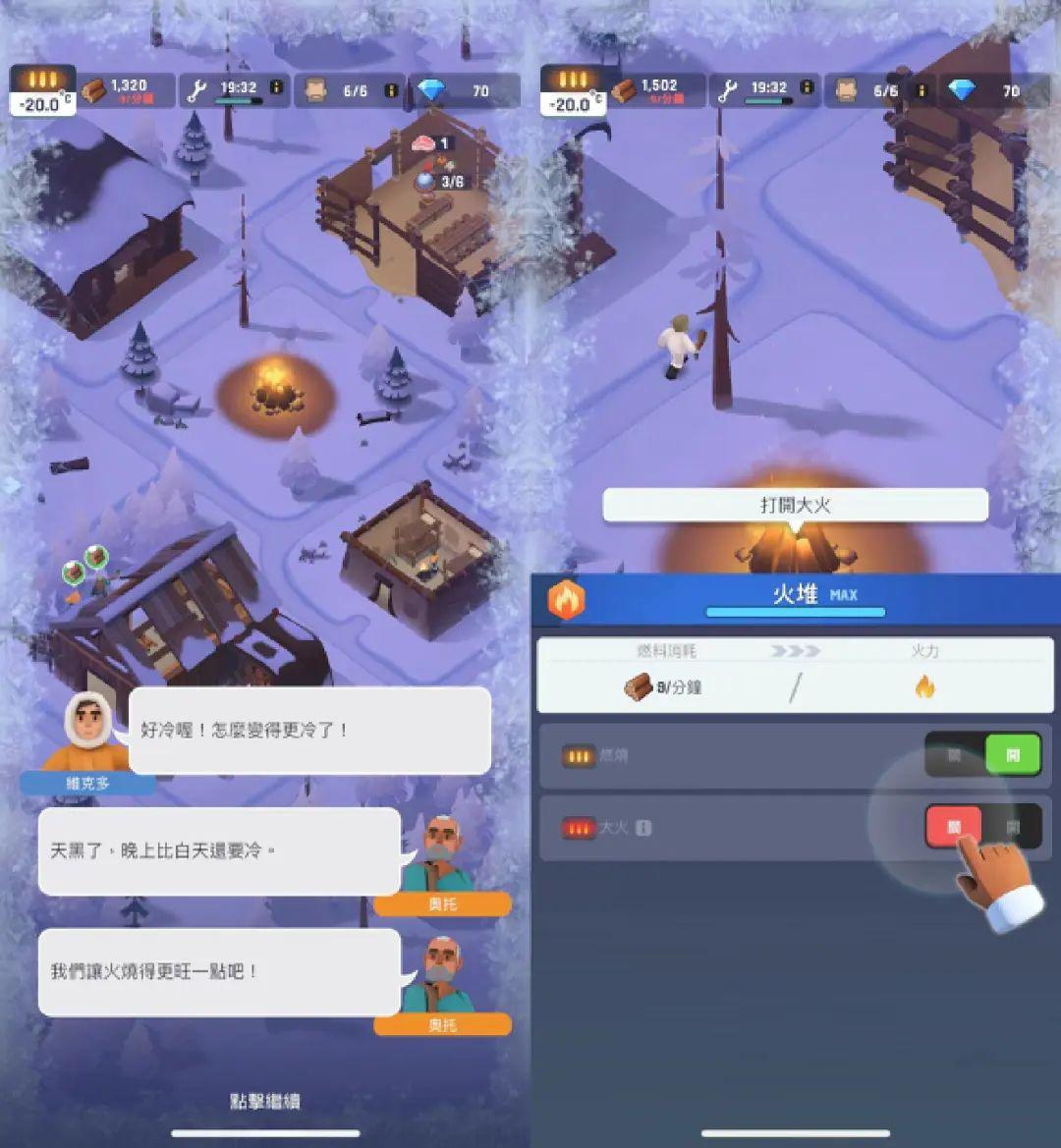 再如点点的《Frozen City》,凭借low poly的卡通风格、冰雪题材+末世生存背景形成了明显的差异化。并且通过卡牌化战斗、放置资源积累之类的元素来提供更多元的玩法反馈。