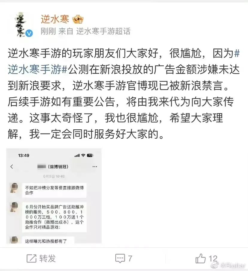 如此“惊天动地”的动作发生点小插曲也并不意外,就在开服当天,逆水寒手游官博正“疯狂”发博之际却惨遭封号。随后“大哥”逆水寒官博发文称,由于为逆水寒手游公测在新浪投放的广告金额涉嫌未达到新浪要求,逆水寒手游官博现已被新浪禁言。逆水寒官博将暂时接手逆水寒手游的微博宣发工作。