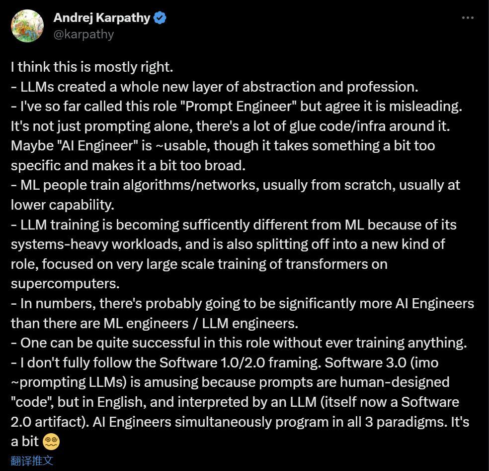 想法一出,AI 领域大 v 们迅速有了点评。OpenAI 科学家、前特斯拉 AI 和自动驾驶主管 Andrej Karpathy 表示赞同。「大模型创建了一个全新的抽象和专业层,到目前为止,我把它称为『提示工程师』,但现在不止是提示的问题。」