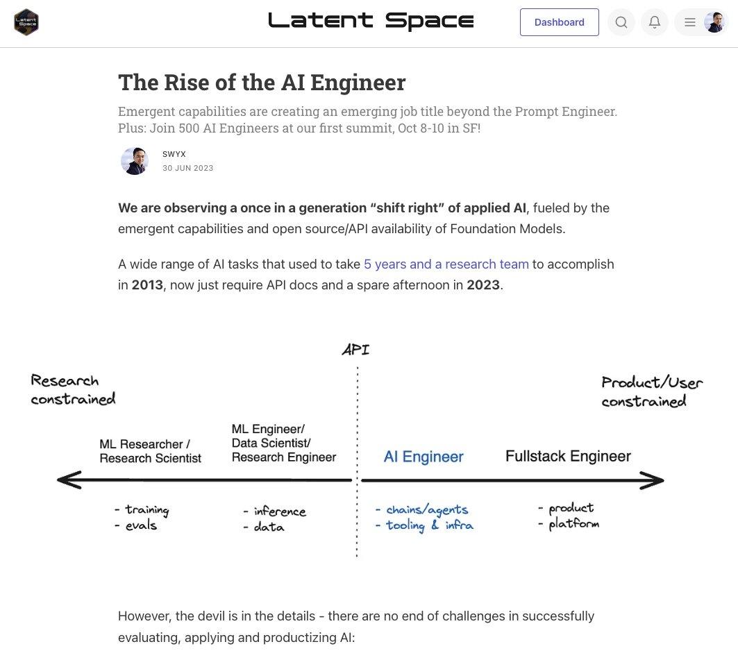 最近,事情看起来有了谱,一群工程师和学者喊出了「AI 工程师」的概念,获得了众多响应: