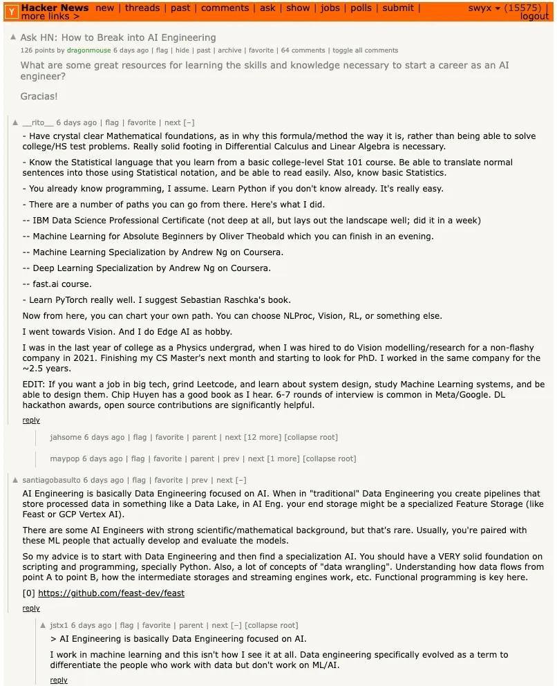 Hacker News 上 2023 年 6 月一个帖子的截图:「如何进入 AI 工程」的热门投票答案。