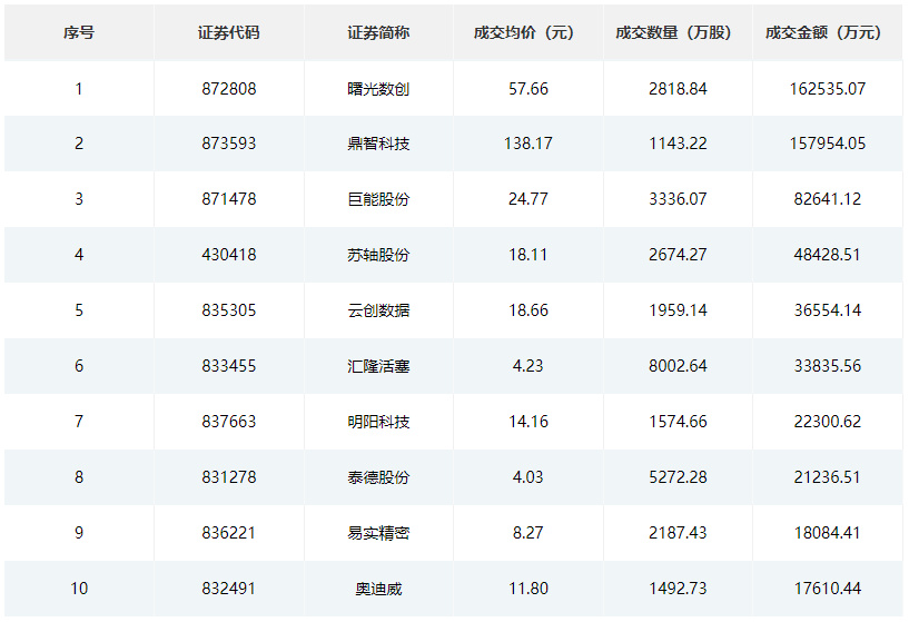 成交方面,本周北交所共成交6.63亿股,环比上周增长112.35%;成交金额为94.7亿元,环比上周增长73.29%。个股方面,成交额前三名分别是曙光数创(872808)、鼎智科技(873593)、巨能股份(871478),分别成交16.25亿元、15.79亿元和8.26亿元,3只个股周换手率分别为41.03%、63.64%、168.48%。整体来看,北交所204家公司平均周换手率为8.7%。