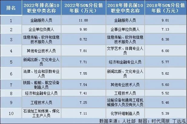究竟什么职业赚钱比较多?哪些岗位工资价位更高?时代周报记者梳理2018至2022这5年的薪酬调查信息后发现,以50%的分位值,也就是以各职业的年薪中位值来排名计算,金融服务人员、企业单位负责人和信息传输、软件和信息技术服务人员的薪资始终稳居前三。