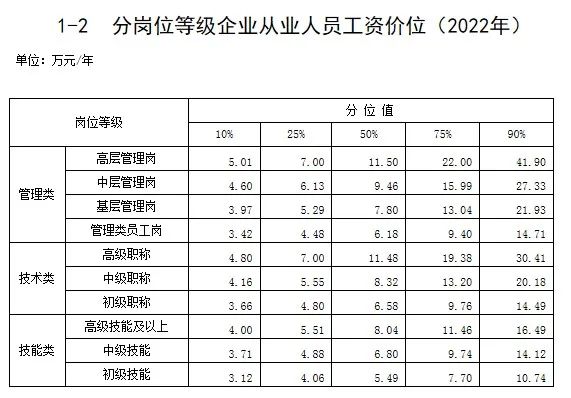 2022年的分岗位等级企业从业人员工资价位中,高层、中层与基层管理岗的各分位值工资,均高于高级、中级、初级职称技术类岗位和高级及以上、中级、初级技能类岗位。